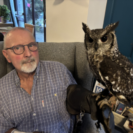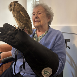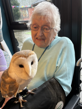 Activities Co-Ordinator Jo Taylor organised the activity: “We always like to put on as many different activities as possible for the residents, so we were really excited about welcoming Richard and his owls. So many residents got to hold them and stroke their soft feathers and were fascinated to learn more about them.”