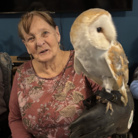 The large living room at the home was packed with residents anticipating the feathered friends. Richard, one of the handlers from Norfolk Owls, introduced each of the different owls to the residents who were enthralled by them, with many taking the opportunity to hold the beautiful creatures using the gloves provided.